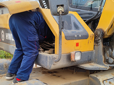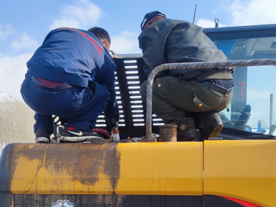 1.檢查大小臂、鏟斗、駕駛室、空濾、配重等各部件情況是否有開裂、損壞、松動(dòng)等情況,并及時(shí)更換調(diào)整。